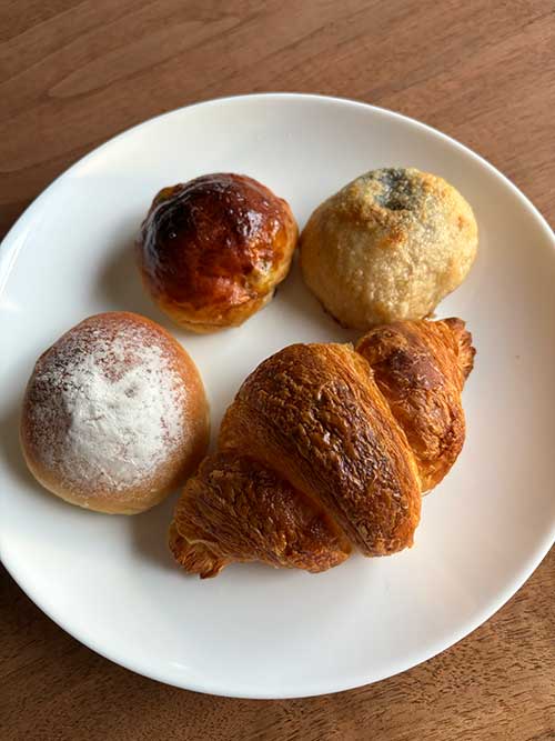 右下から、クロワッサン、モーニングロール2種、パン・オリーブ・フロマージュ。