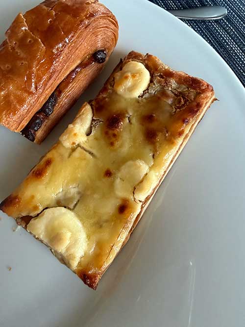 クラヴァットはカスタードクリームとチョコチップが入ってて、リベイクして食べるとクロワッサン生地のパリパリと中が少しとろりとした感じがたまりません。塩パンもサクッとして美味しい。