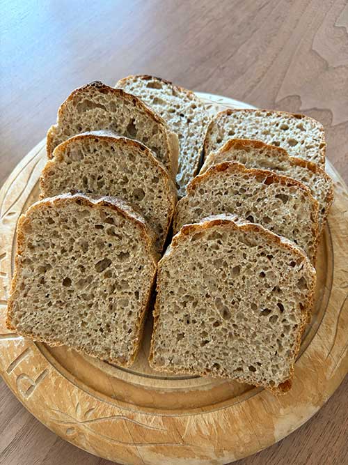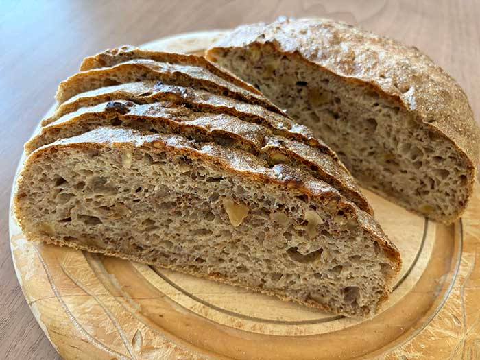 いつもの全粒粉の配合に、ローストしたくるみを混ぜ込んで焼きました。くるみパンを焼くのは久しぶり。香ばしくて美味しい。