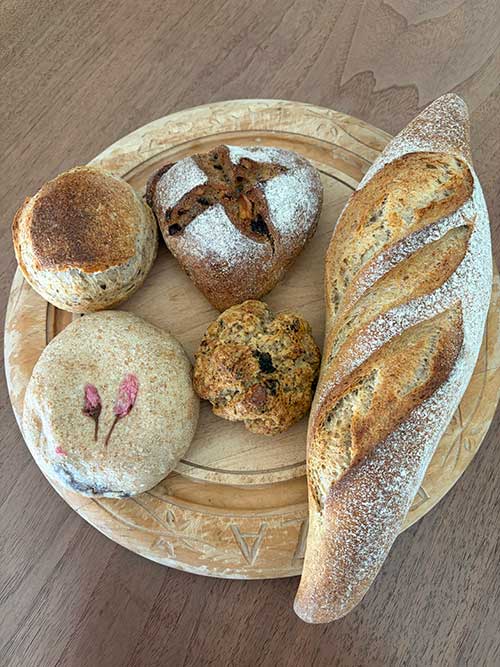 左上から時計回りに バジル260円 イチジク400円 ライ麦バケット400円 紅茶くるみスコーン300円 さくらあんぱん300円